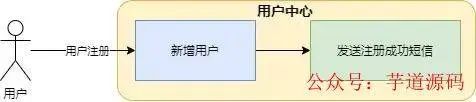 图中,新增用户 和发送短信 都揉在用户中心服务里,这种方式缺点非常明显:
