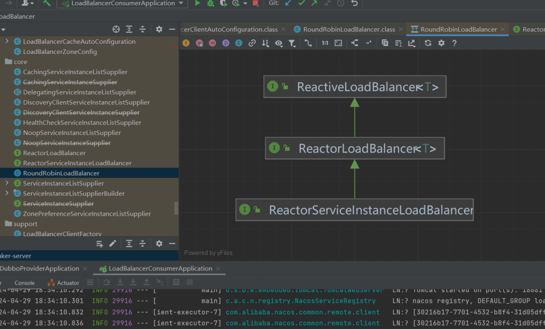 RoundRobin源码,自定义NacosWeightLoadBalancerimport org.apache.commons.logging.Log;import org.apache.commons.logging.LogFactory;import org.springframework.beans.factory.ObjectProvider;import org.springframework.cloud.client.ServiceInstance;import org.springframework.cloud.client.loadbalancer.DefaultResponse;import org.springframework.cloud.client.loadbalancer.EmptyResponse;import org.springframework.cloud.client.loadbalancer.Request;import org.springframework.cloud.client.loadbalancer.Response;import org.springframework.cloud.loadbalancer.core.*;import reactor.core.publisher.Mono;import java.util.*;import java.util.concurrent.ThreadLocalRandom;/** * 基于nacos权重的负载均衡*/public class NacosWeightLoadBalancer implements ReactorServiceInstanceLoadBalancer { private static final Log log = LogFactory.getLog(NacosWeightLoadBalancer.class); private final String serviceId; private ObjectProvider<ServiceInstanceListSupplier> serviceInstanceListSupplierProvider; //nacos权重获取名称,在nacos元数据中 private static final String NACOS_WEIGHT_NAME = "nacos.weight"; public NacosWeightLoadBalancer(ObjectProvider<ServiceInstanceListSupplier> serviceInstanceListSupplierProvider, String serviceId) { this.serviceId = serviceId; this.serviceInstanceListSupplierProvider = serviceInstanceListSupplierProvider; } @Override public Mono<Response<ServiceInstance>> choose(Request request) { ServiceInstanceListSupplier supplier = this.serviceInstanceListSupplierProvider.getIfAvailable(NoopServiceInstanceListSupplier::new); return supplier.get(request).next().map((serviceInstances) -> { return this.processInstanceResponse(supplier, serviceInstances); }); } private Response<ServiceInstance> processInstanceResponse(ServiceInstanceListSupplier supplier, List<ServiceInstance> serviceInstances) { Response<ServiceInstance> serviceInstanceResponse = this.getInstanceResponse(serviceInstances); if (supplier instanceof SelectedInstanceCallback && serviceInstanceResponse.hasServer()) { ((SelectedInstanceCallback)supplier).selectedServiceInstance(serviceInstanceResponse.getServer()); } return serviceInstanceResponse; } private Response<ServiceInstance> getInstanceResponse(List<ServiceInstance> instances) { if (instances.isEmpty()) { if (log.isWarnEnabled()) { log.warn("No servers available for service: " + this.serviceId); } } else { //根据权重选择实例,权重高的被选中的概率大 //nacos.weight的值越大,被选中的概率越大 Double totalWeight = 0D; for (ServiceInstance instance : instances) { String s = instance.getMetadata().get(NACOS_WEIGHT_NAME); double weight = Double.parseDouble(s); totalWeight = totalWeight + weight; //放置当前实例的权重区间 instance.getMetadata().put("weight",String.valueOf(totalWeight)); } //随机获取一个区间类的数值,nacos权重越大,区间越大,则随机数值落到相应的区间的概率是由区间的大小来决定的。 double index = ThreadLocalRandom.current().nextDouble(totalWeight); //根据权重区间选择实例 for (ServiceInstance instance : instances) { double weight = Double.parseDouble(instance.getMetadata().get("weight")); if (index <= weight) { return new DefaultResponse(instance); } } } return new EmptyResponse(); }}