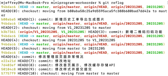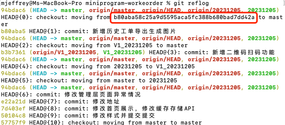 1、进入到项目对应目录,执行git reflog命令,查看git库提交记录,查找到丢失的是哪次记录