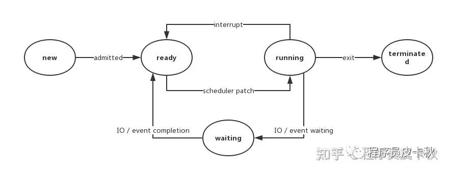 首先最开始是创建阶段 NEW, 下一个阶段是就绪阶段 Ready, 紧接着就是调度转为执行阶段 Running, 执行的这个过程中,可能会被打断又变为Ready阶段,还有可能一些IO阻塞事件又变为等待阶段 Waiting, 这个阶段又转换为 Ready阶段,当退出时,会转化为结束阶段 Terminated。说的有点抽象,大家可以对照下图理解一下。