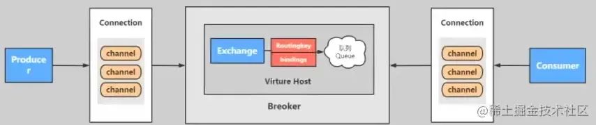 Bindings:exchange 和 queue 之间的虚拟连接,binding 中可以保存多个 routing key -