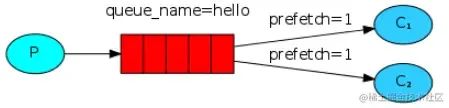 在这种模式下,rabbitmq 采用轮询的方式将任务分配给多个消费者,但可能出现一种情况,当分配给某一个消费者的任务很复杂时,而有些消费者接收的任务较轻量,会出现有的消费者很忙,而有的消费者处于空闲的状态,而 rabbitmq 不会感知到这种情况的发生,rabbitmq 不考虑消费者未确认消息的数量,只是盲目的分配任务。