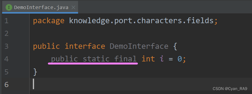 我们以DemoInterface接口为演示接口,在该接口中定义i变量,并定义Test类作为测试类,如下所示 :