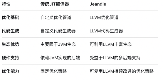 下面的表格对比了传统JIT编译器与Jeandle的主要区别: