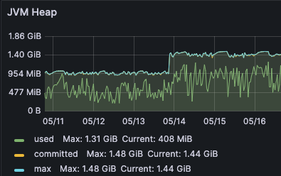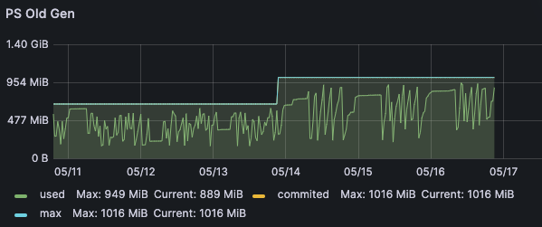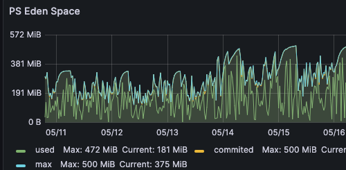 查看近 7 天的堆内存、新生代 Eden 区、老年代的内存使用情况,虽然内存调大了,但是基本都是快使用完才进行GC 。