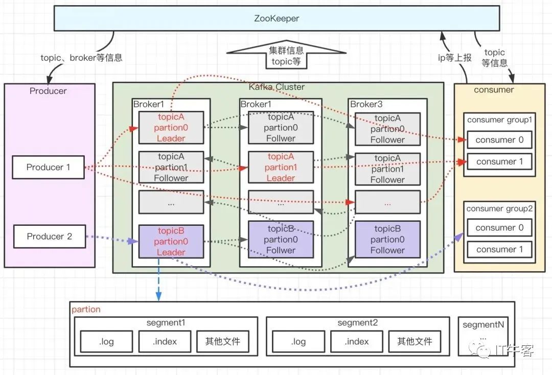ZooKeeper:负责 broker、consumer 集群元数据的管理等;(注意:Producer 端直接连接 broker,不在 zk 上存任何数据,只是通过 ZK 监听 broker 和 topic 等信息)