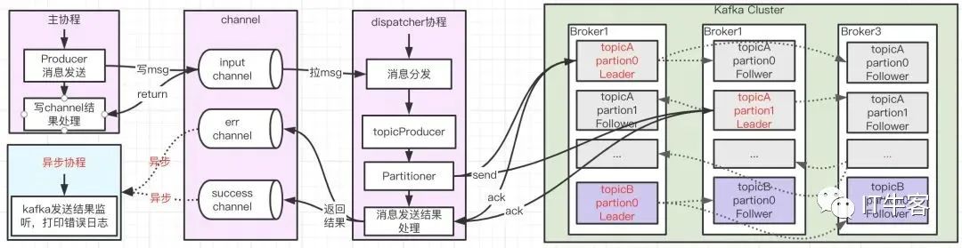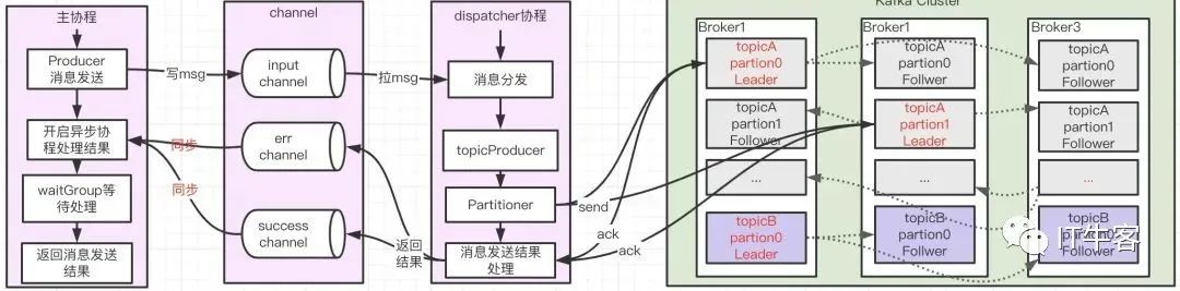 以 sarama 实现为例,在消息发送的过程中,无论是同步发送还是异步发送都会涉及到两个协程--负责消息发送的主协程和负责消息分发的 dispatcher 协程。