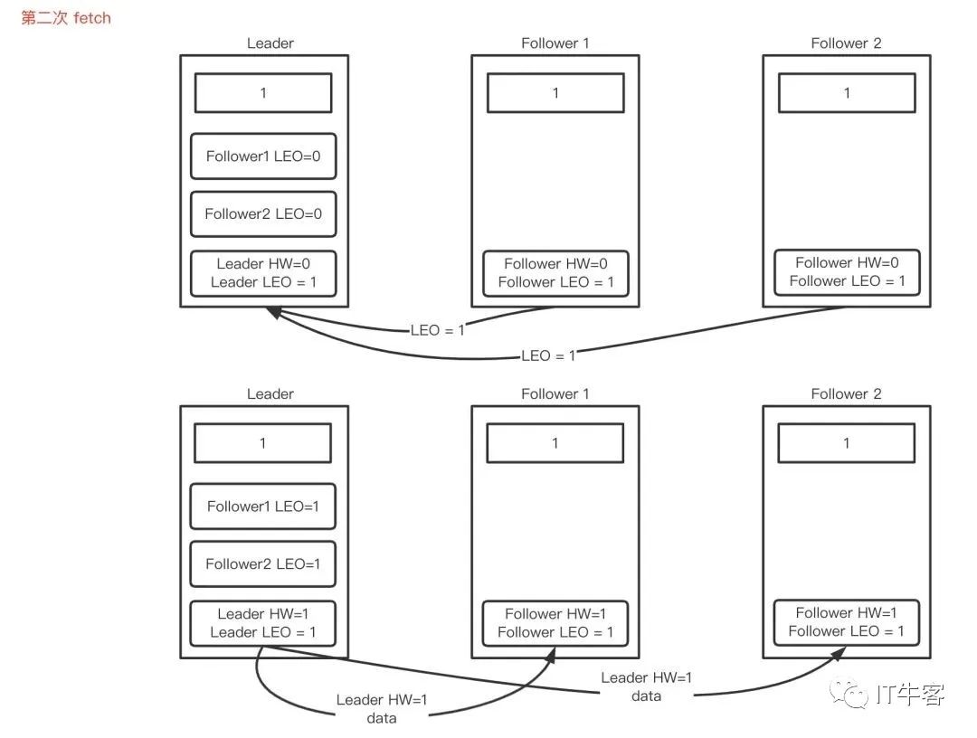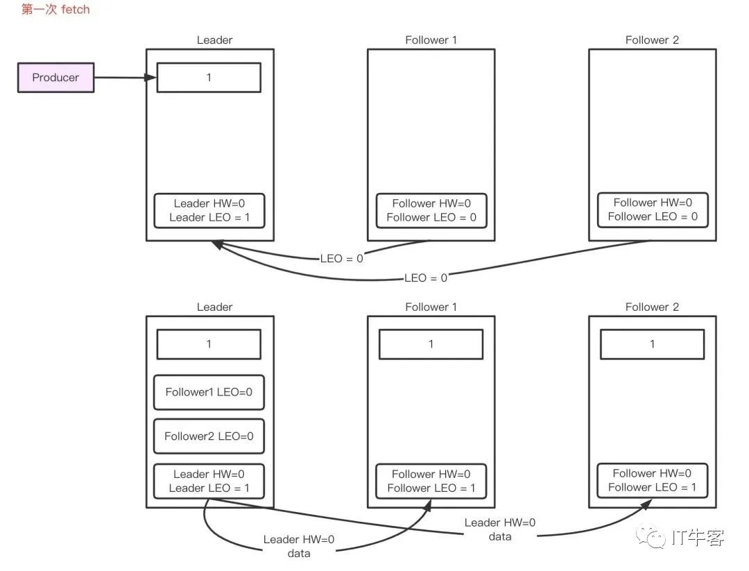 Follower从Leader fetch数据, Leader收到请求,记录follower的LEOF =0,并且尝试更新HWL =min(全部副本LEO)=0; eade返回HWL=0和LEOL=1给Follower,Follower存储消息并更新LEOF =1, HW=min(LEOF,HWL)=0。