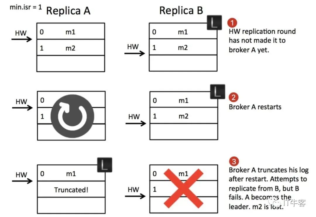 B 崩溃了,min.isr 设置的是 1,所以 zookeeper 会从 ISR 中再选择一个作为 leader,也就是 A,但是 A 的数据不是完整的,从而出现了数据丢失现象。