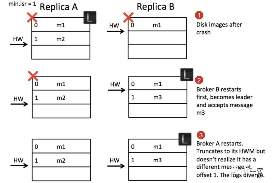 在分析日志错乱的问题之前,我们需要了解到 kafka 的副本可靠性保证有一个前提:在 ISR 中至少有一个节点。如果节点均宕机的情况下,是不保证可靠性的,在这种情况会出现数据丢失,数据丢失是可接受的。这里我们分析的问题比数据丢失更加槽糕,会引发日志错乱甚至导致整个系统异常,而这是不可接受的。