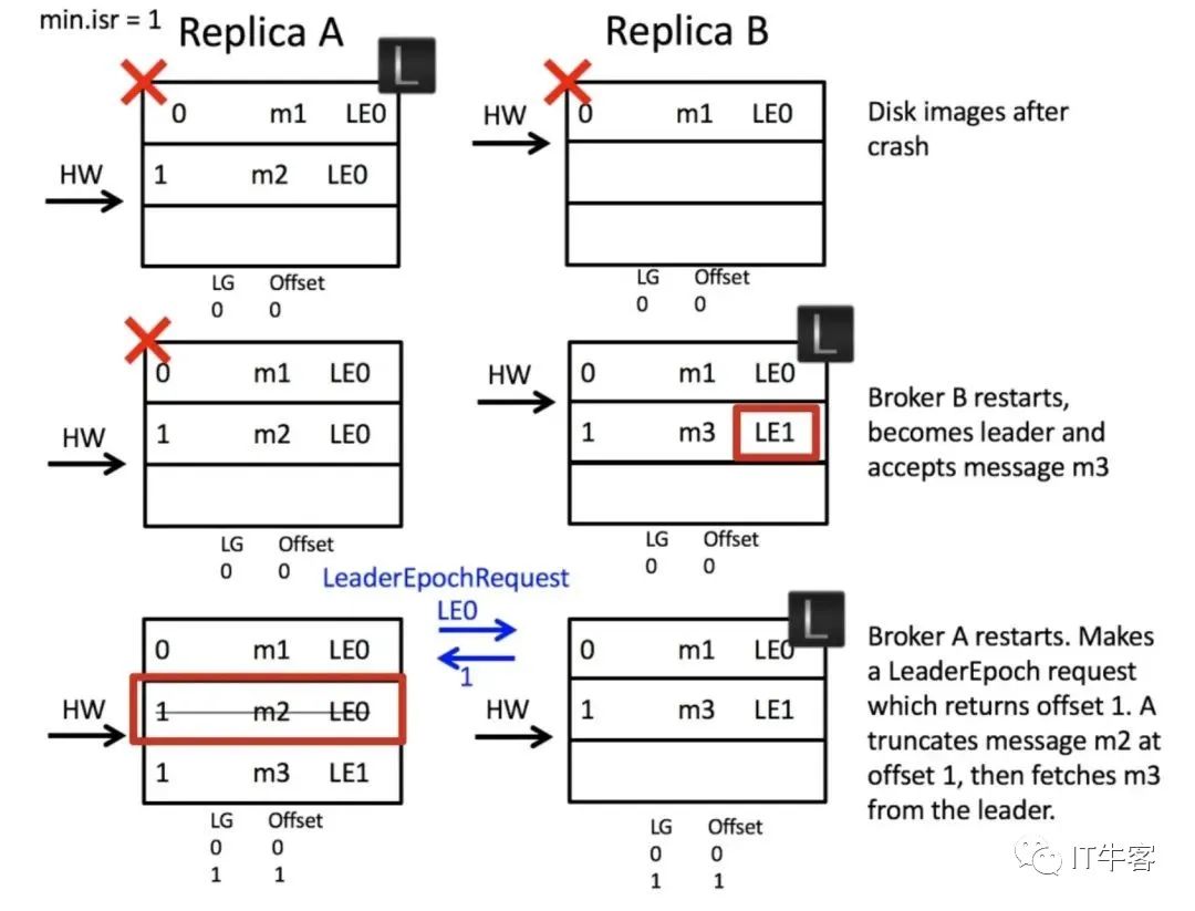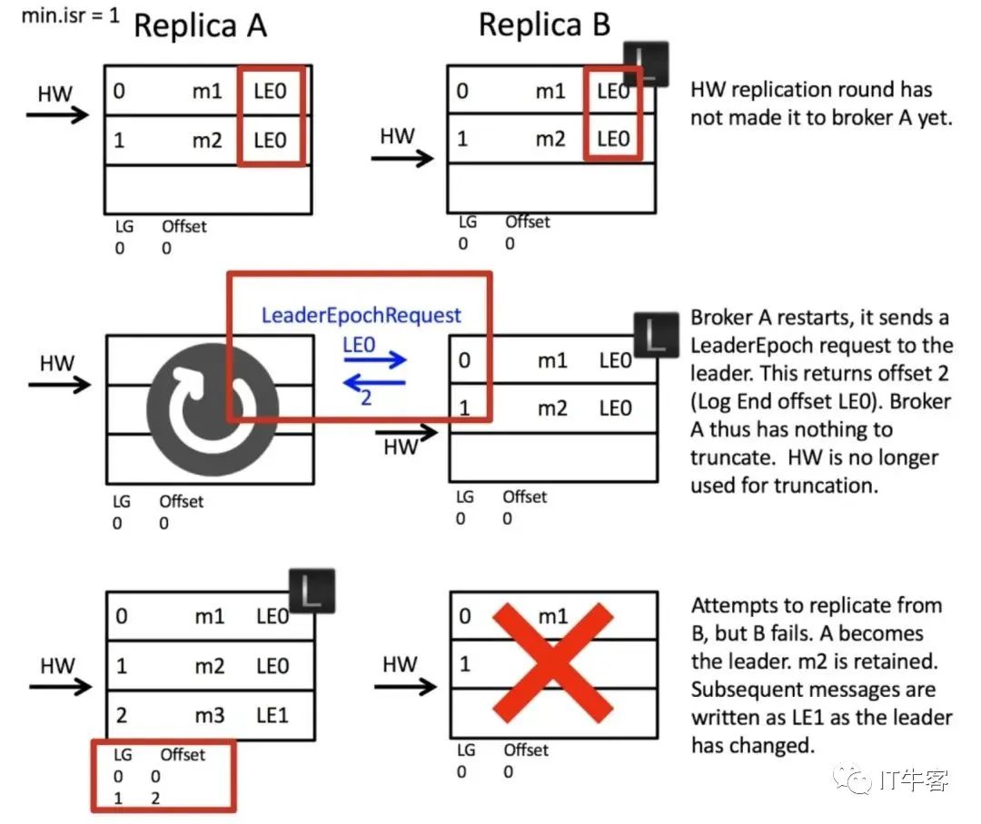 这里的关键点还是在第 3 步,副本 A 重启作为 follower 的第一步还是需要发起 LeaderEpochRequest 询问 leader 当前第 0 代最新的偏移量是多少,由于副本 B 已经经过换代,所以会返回给 A 第 1 代的起始偏移(也就是 1),A 发现冲突后会截断自己偏移量为 1 的日志,并重新开始和 leader 同步。副本 A 和副本 B 的日志达到了一致,解决了日志错乱。