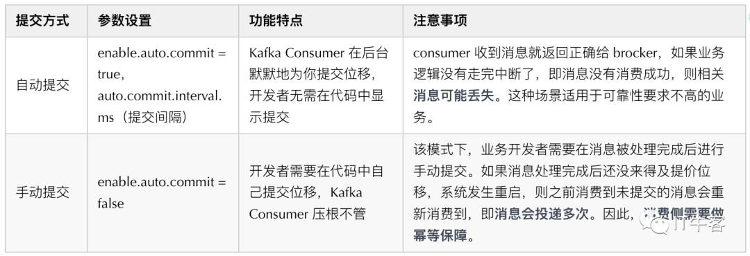 Consumer 在消费消息的过程中需要向 Kafka 汇报自己的位移数据,只有当 Consumer 向 Kafka 汇报了消息位移,该条消息才会被 Broker 认为已经被消费。因此,Consumer 端消息的可靠性主要和 offset 提交方式有关,Kafka 消费端提供了两种消息提交方式: