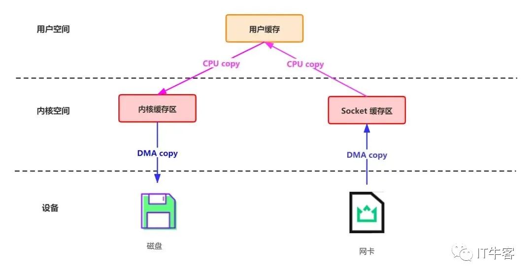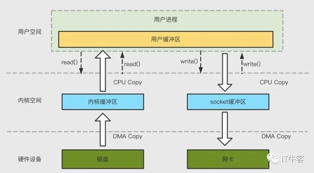 传统模式下,数据从网络传输到文件需要 4 次数据拷贝、4 次上下文切换和两次系统调用。如下图所示: