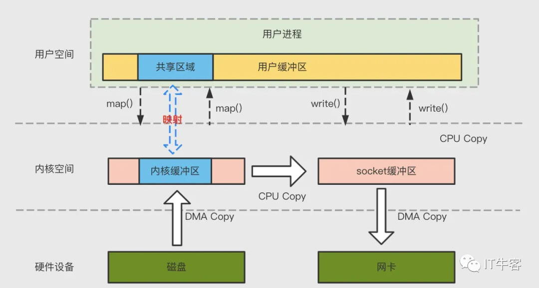 Kafka 中存在大量的网络数据持久化到磁盘(Producer 到 Broker)和磁盘文件通过网络发送(Broker 到 Consumer)的过程,这一过程的性能直接影响 Kafka 的整体吞吐量。传统的 IO 操作存在多次数据拷贝和上下文切换,性能比较低。Kafka 利用零拷贝技术提升上述过程性能,其中网络数据持久化磁盘主要用 mmap 技术,网络数据传输环节主要使用 sendfile 技术。