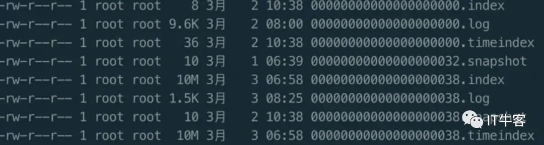 为了方便对日志进行检索和过期清理,kafka 日志文件除了有用于存储日志的.log 文件,还有一个位移索引文件.index和一个时间戳索引文件.timeindex 文件,并且三文件的名字完全相同,如下: