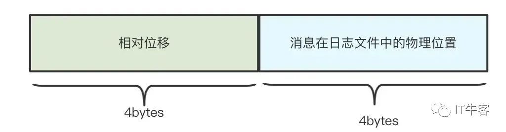 相对位移:保存于索引文件名字上面的起始位移的差值,假设一个索引文件为:00000000000000000100.index,那么起始位移值即 100,当存储位移为 150 的消息索引时,在索引文件中的相对位移则为 150 - 100 = 50,这么做的好处是使用 4 字节保存位移即可,可以节省非常多的磁盘空间。
