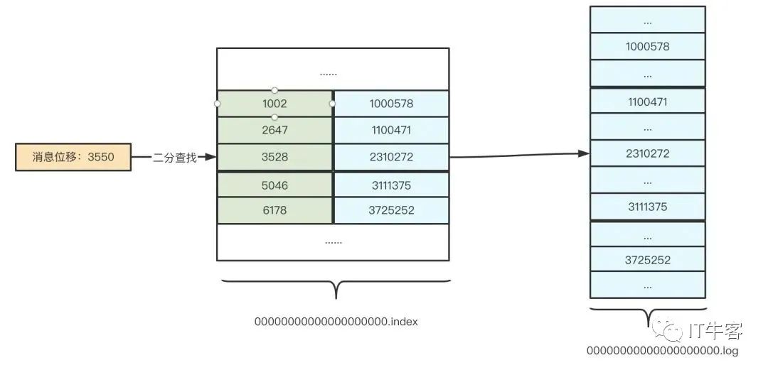 文件物理位置:消息在 log 文件中保存的位置,也就是说 Kafka 可根据消息位移,通过位移索引文件快速找到消息在 log 文件中的物理位置,有了该物理位置的值,我们就可以快速地从 log 文件中找到对应的消息了。下面我用图来表示 Kafka 是如何快速检索消息: