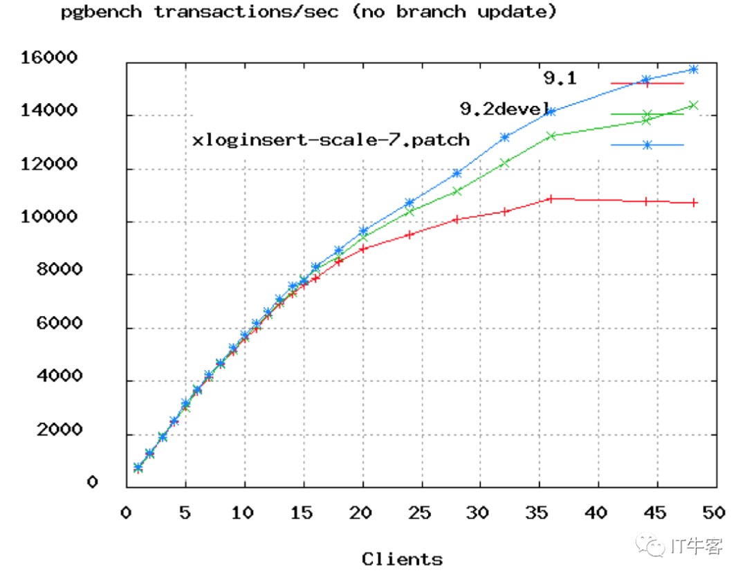 上图是PostgreSQL的benchmark数据,可以看到TPS增长率从50个连接数开始变缓。在上面Oracle的视频中,他们把连接数从2048降到了96,实际上96都太高了,除非服务器有16或32颗核心。