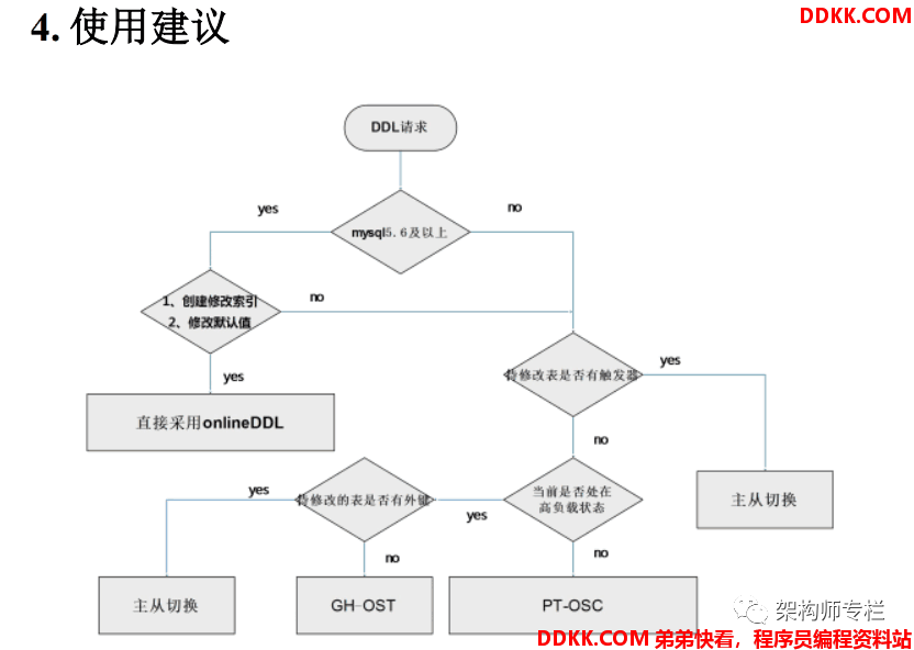 对大表进行 DDL 操作时,要考虑表的实际情况(如对该表的并发表,是否有外键)来选择合适的 DDL 变更方式。