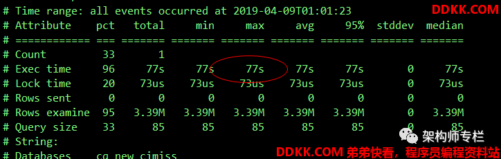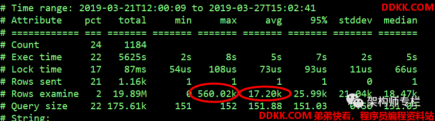 最近一个星期内,总共记录的慢查询执行花费时间为 25403s,最大的慢 SQL 执行时间为 266s,平均每个慢 SQL 执行时间 5s,平均扫描的行数为 1766 万。
