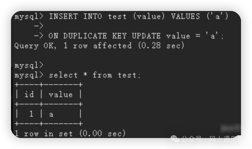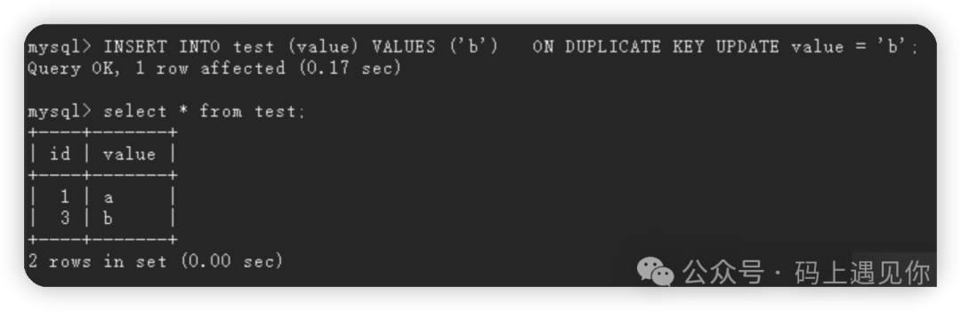 此时,由于 value 列存在唯一键约束,并且已经存在一条记录 value='a',所以不会插入新记录,而是会执行更新操作。但即便如此,自增主键 id 的计数器依然会增加。