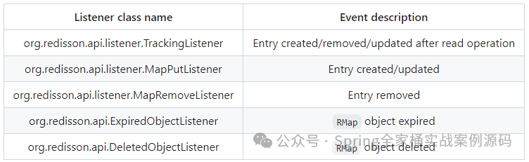 Redisson 允许为每个 RMap 对象绑定监听器,RMap 对象允许跟踪数据上的跟踪事件。如下表,监听类及事件