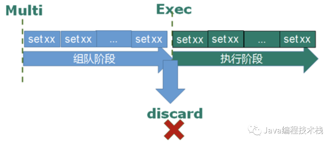 Redis 事务中有 MultiExecdiscard 三个指令,在 Redis 中,从输入 Multi 命令开始,输入的命令都会依次进入命令队列中,但不会执行,直到输入 Exec 后,Redis 会将之前的命令队列中的命令依次执行。而组队的过程中可以通过 discard 来放弃组队
