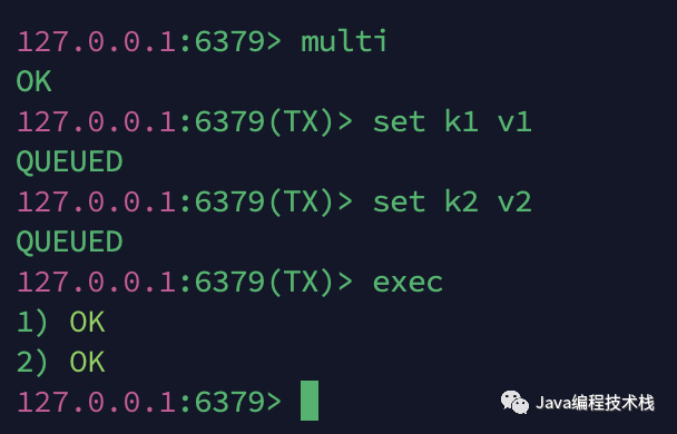 组队成功:我们输入multi进行组队,将set k1 v1set k2 v2两条命令插入到队列中,然后输入exec执行命令,最后执行成功。