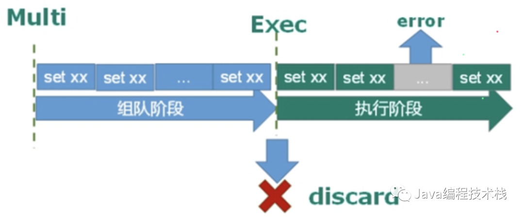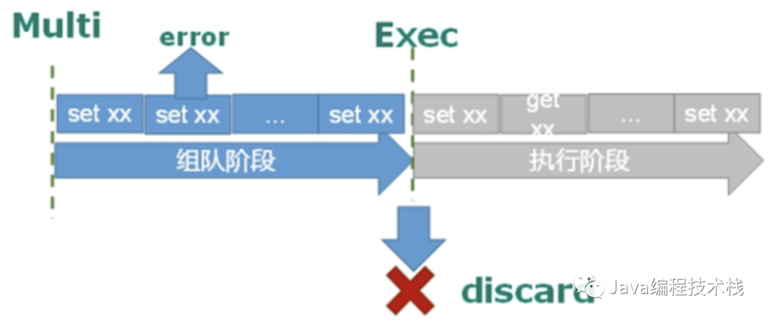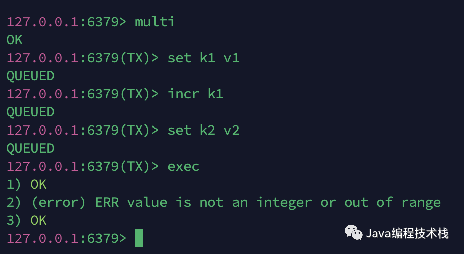 组队阶段报错:我们输入multi进行组队,将set k1 v1set k2两条命令插入到队列中,由于set k2这条命令报错了,所以在组队阶段就已经失败了,所以执行exec也就全部失败了,注意:set k1 v1这条命令不会被执行