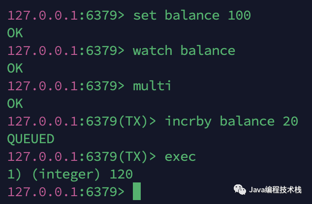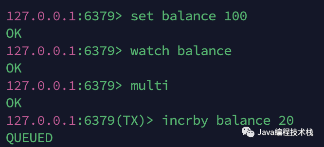 我们先设置一个金额100,使用watch对balance进行监控,然后开启事务增加20金额