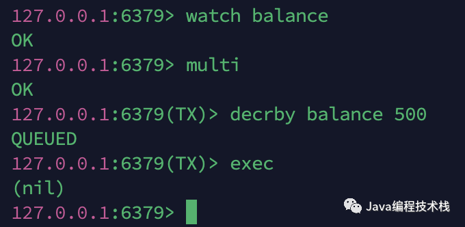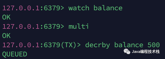 再启动另一个窗口,也使用watch对balance进行监控,然后开启事务减少金额500