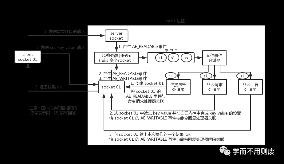 如果此时客户端准备好接收返回结果了,那么 Redis 中的 socket01 会产生一个 AE_WRITABLE 事件,同样压入队列中,事件分派器找到相关联的命令回复处理器,由命令回复处理器对 socket01 输入本次操作的一个结果,比如 ok ,之后解除 socket01 的 AE_WRITABLE 事件与命令回复处理器的关联。