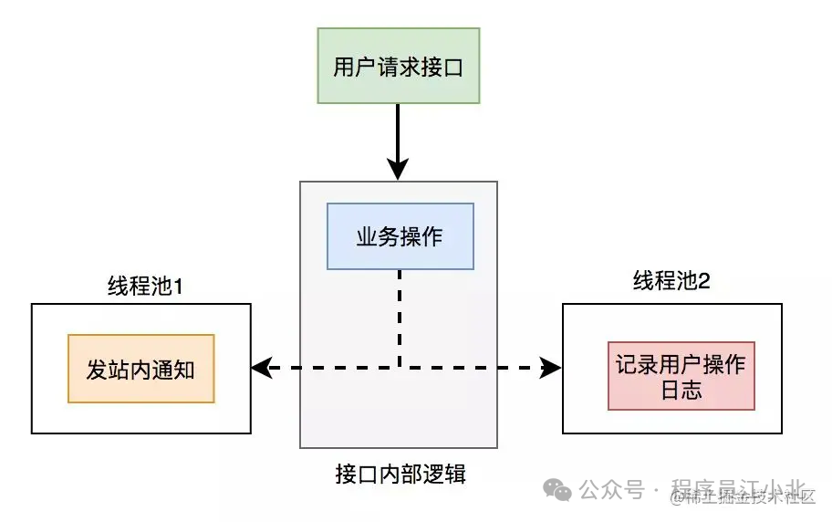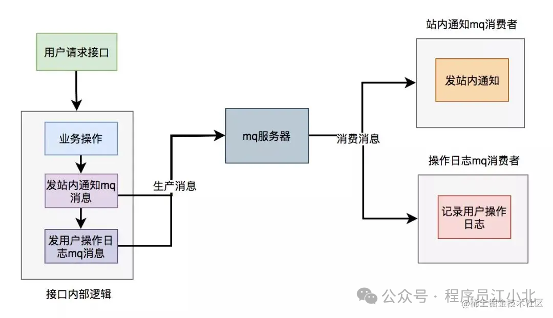 上面这个例子中,发站内通知和用户操作日志功能,对实时性要求不高,即使晚点写库,用户无非是晚点收到站内通知,或者运营晚点看到用户操作日志,对业务影响不大,所以完全可以异步处理。