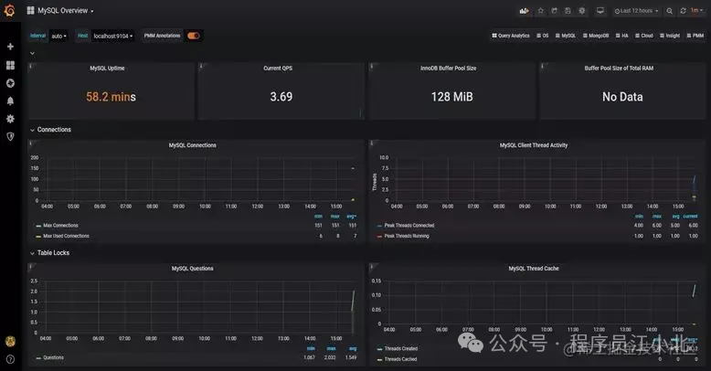 可以看到MySQL的当前QPS、活跃线程数、连接数、缓存池的大小等信息。