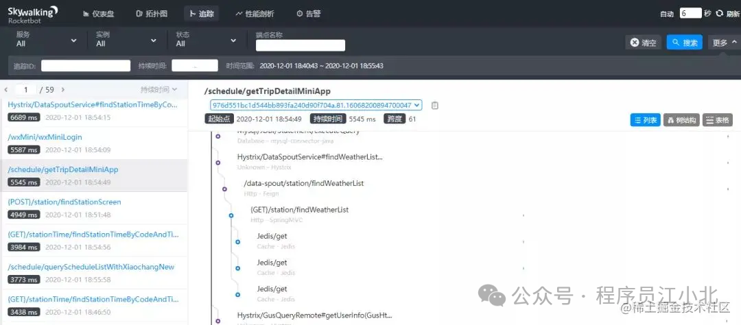 在SkyWalking中,可以通过traceId(全局唯一的ID)来串联一个接口请求的完整链路。你可以看到整个接口的耗时、调用的远程服务的耗时、访问数据库或者Redis的耗时等,功能非常强大。