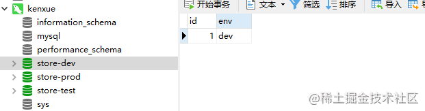 从上面我们知道,三个yaml文件主要配置的是数据库,分为dev,test,prod三个库,我也在数据库创建了三个数据,等一下我们要根据不同的配置获取不同的数据库的数据, 三个数据库如下,其中每个库里面都有一张表,分别放了一条测试数据。