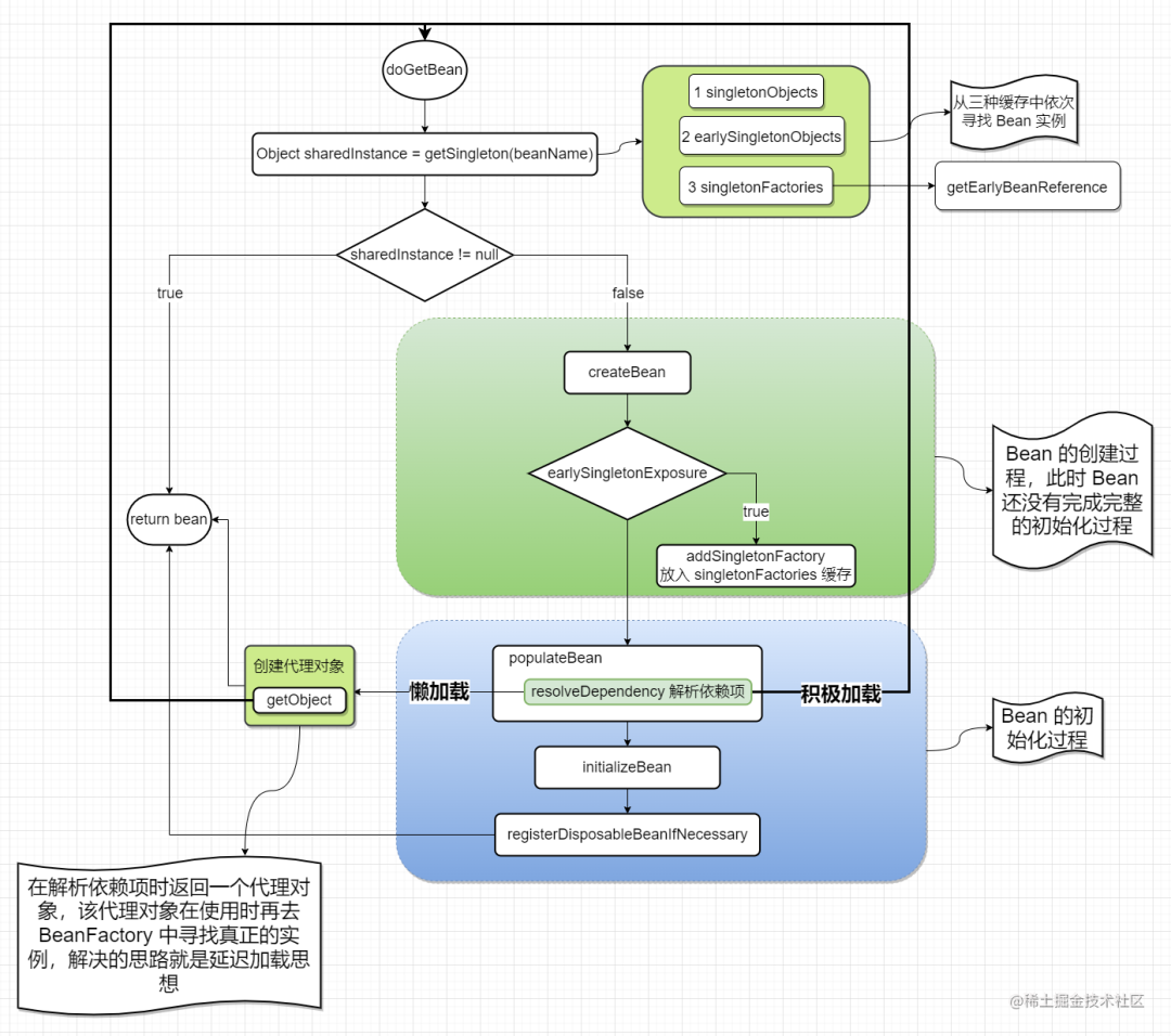 本章讲解了 构造器依赖注入时循环引用 和 属性方法依赖注入时循环引用 的场景。在构造器注入时得到的依赖项是经过了完整的初始化过程的,可以说是得到的一个完整的 bean 。而属性或方法注入的场景得到的 bean 是没有经过完全初始化的,所以在使用 bean 时需要警惕.
