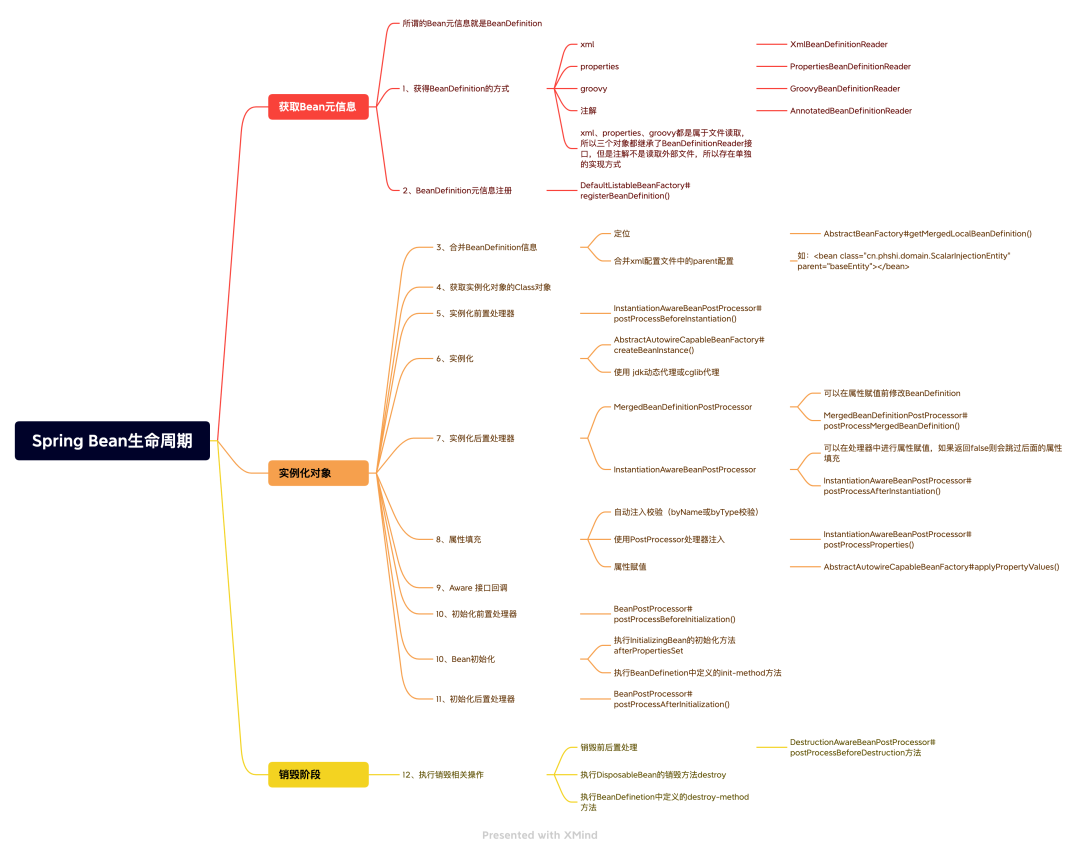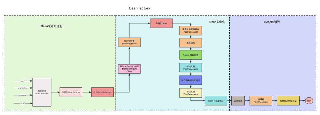 在Spring中,Bean生命周期从流程上来分析大概可以得到上面的图片,各个环节涉及到的对象大概如下图: