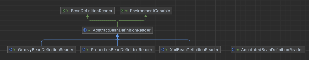 从上图我们可以看到,Xml、Properties、Groovy的读取方式都继承了AbstractBeanDefinitionReader,而使用注解方式的没有继承而是有单独的实现,其实这个也很好理解,因为前三个都是读取的外部化文件进行解析获取,所以有统一读取的规范,而注解是直接嵌插在Java代码中的,所以与前三个读取方式会有所不同。