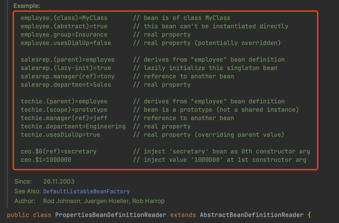Xml注册中的语法我们已经很熟悉,而对于Properties和Groovy的我们可以参考各个读取实现对象上面的注释,而一般情况我们也不会用到这两种读取方式。