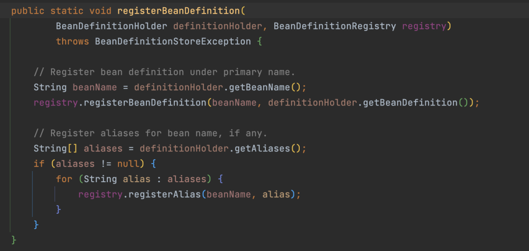 Bean元信息注册有个工具类BeanDefinitionReaderUtils,我们来看一下他注册BeanDefinition的方法: