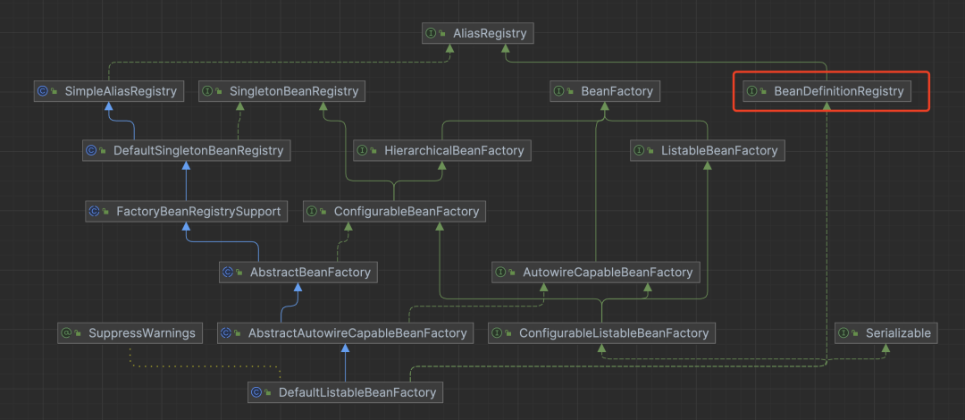 一个BeanFactory的实例对象通常还是一个Bean元信息的注册对象,所以上面的BeanDefinitionRegistry通常就是一个IOC容器对象,我们拿DefaultListableBeanFactory的容器对象来看(他是IOC容器,但是本身也是是一个BeanDefinitionRegistry)