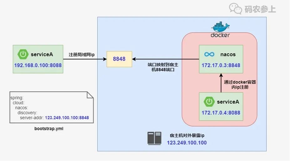 如果这个调用请求被负载均衡到本地serviceA的话,那么没什么问题,两个服务都在同一个192.168网段内,可以正常访问。但是如果负载均衡请求到运行在docker内的serviceA的话,那么问题来了,因为网络不通,所以会请求失败: