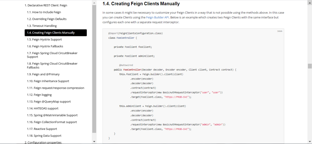 除了像源码中那样生成动态代理以及拦截方法,官方文档中还给我们提供了一个手动创建FeignClient的方法。